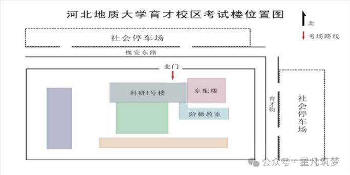 请考生从槐安东路河北地质大学育才校区北门进入校园,考试楼位于科研1号楼。