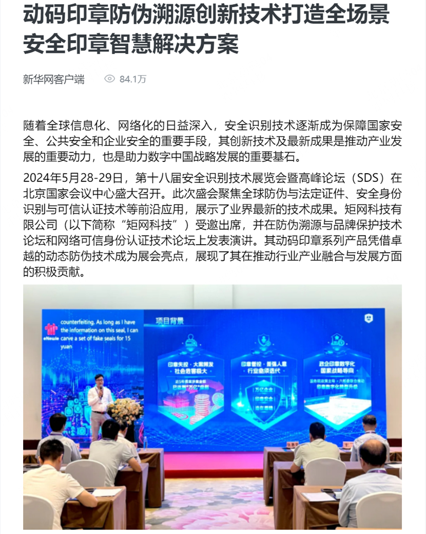 新华网消息,2024年5月28-29日,第十八届安全识别技术展览会暨高峰论坛(SDS)在北京国家会议中心盛大召开。此次盛会聚焦全球防伪与法定证件、安全身份识别与可信认证技术等前沿应用,展示了业界最新的技术成果。矩网科技有限公司(以下简称“矩网科技”)受邀出席,并在防伪溯源与品牌保护技术论坛和网络可信身份认证技术论坛上发表演讲。动码印章系列产品凭借卓越的动态防伪技术成为展会亮点,展现了其在有助于行业产业融合与开展方面的持续贡献。