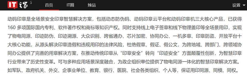 另据环京津新闻网、IT之家、北京晚报、中国商报网、中国开展网报道,动码印章是全场景安全印章智慧解决方案,包括动态防伪码、动码印章云平台和动码印章机三大核心产品,已取得160多项国际国内专利、软件著作权和商标等知识产权。同时支持线上电子签章和线下物理盖印等全场景用印,实现了物电同源、印迹防伪、印迹溯源、大众识别、跨省通办、芯片加密、协同办公、一机多章、印章防盗、开放平台十大核心功能,从源头解决印章造假和违规用印的法律风险,杜绝假章、假证、假公文,为跨地域、跨部门、跨领域协同办公给予了完善的用章解决方案,在有助于传统印章从“印章安全”转向“印迹安全”方面颠覆性创新,为智慧印章行业带来了历史性变革。可与多种应用场景深度融合,为政企组织单位给予了物电同源一体化的智慧印章解决方案。如军队、政府机关、外交、企事业单位、教育、银行、医院、社会各类组织、个人等,保证用印同源、同模、同权。