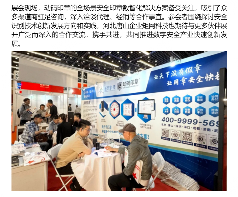 学习强国(中国财富网)、界面新闻主站、第一科技网、中国经济导报等媒体还对活动现场进行了报道。展会现场,动码印章的全场景安全印章数智化解决方案备受关注,吸引了众多渠道商驻足咨询,深入洽谈代理、经销等合作事宜。参会者围绕探讨安全识别技术创新开展方向和实践,河北唐山企业矩网科技也期待与更多伙伴展开广泛而深入的合作研讨,携手共进,共同推进数字安全产业快速创新开展。